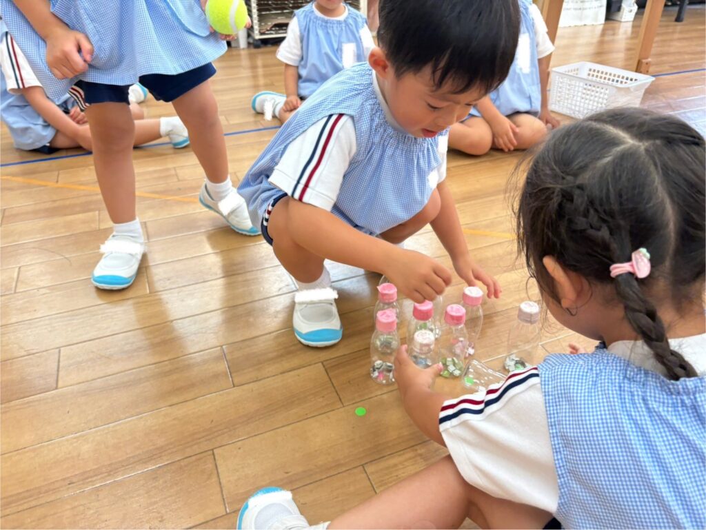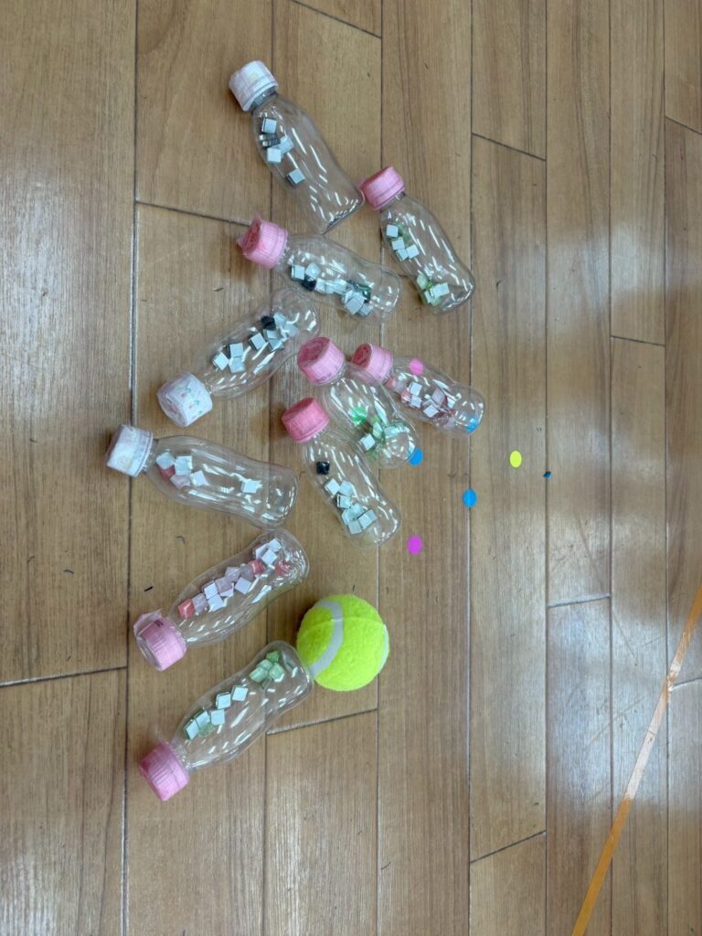 まず点字シールの上にシャカシャカ♩と音の鳴るボトルを協力して立たせます!
