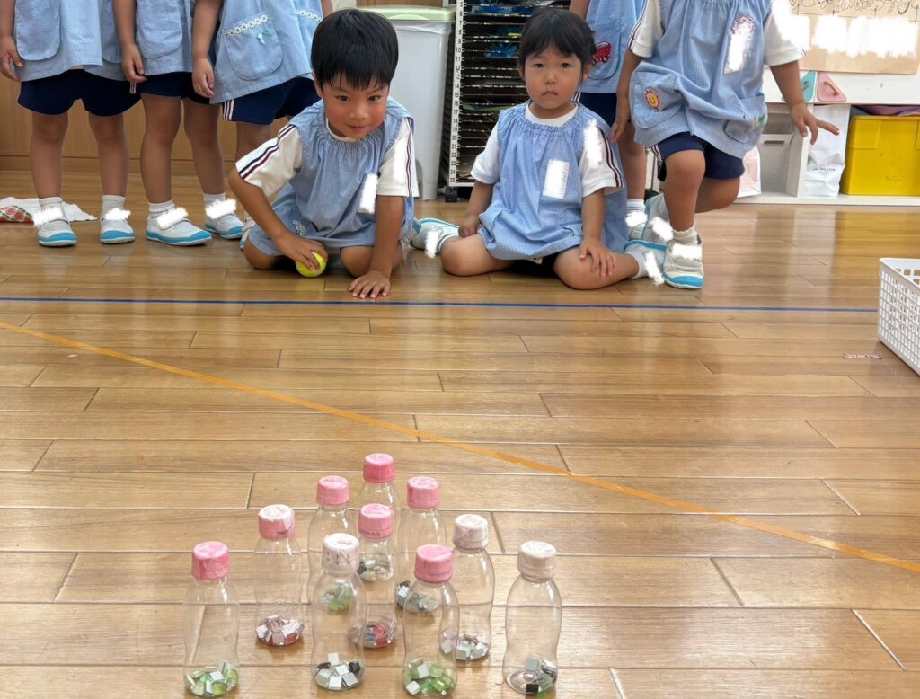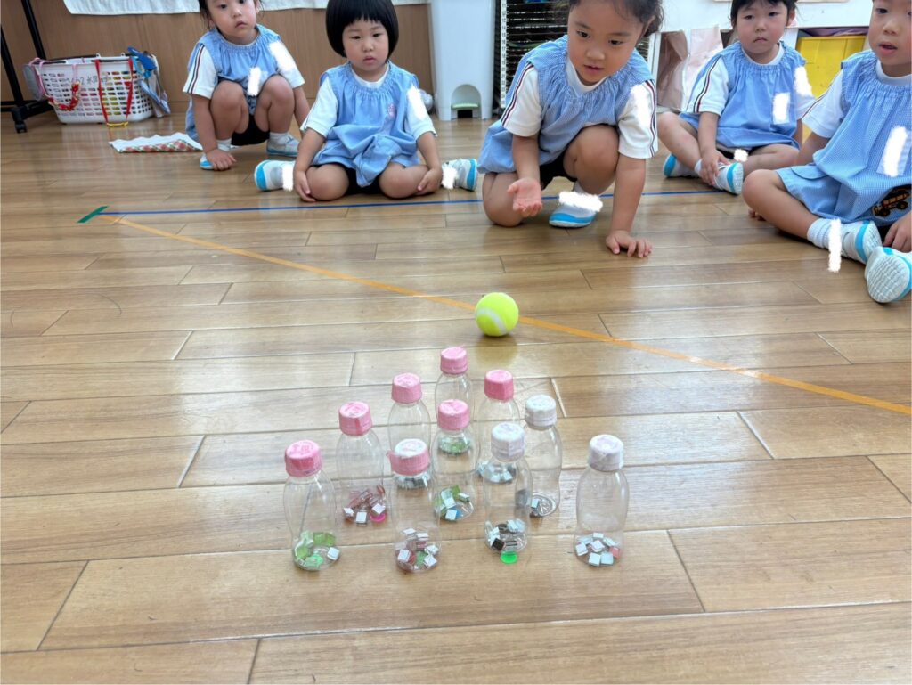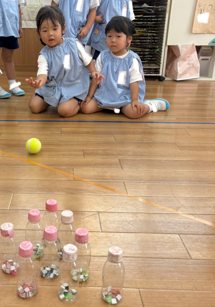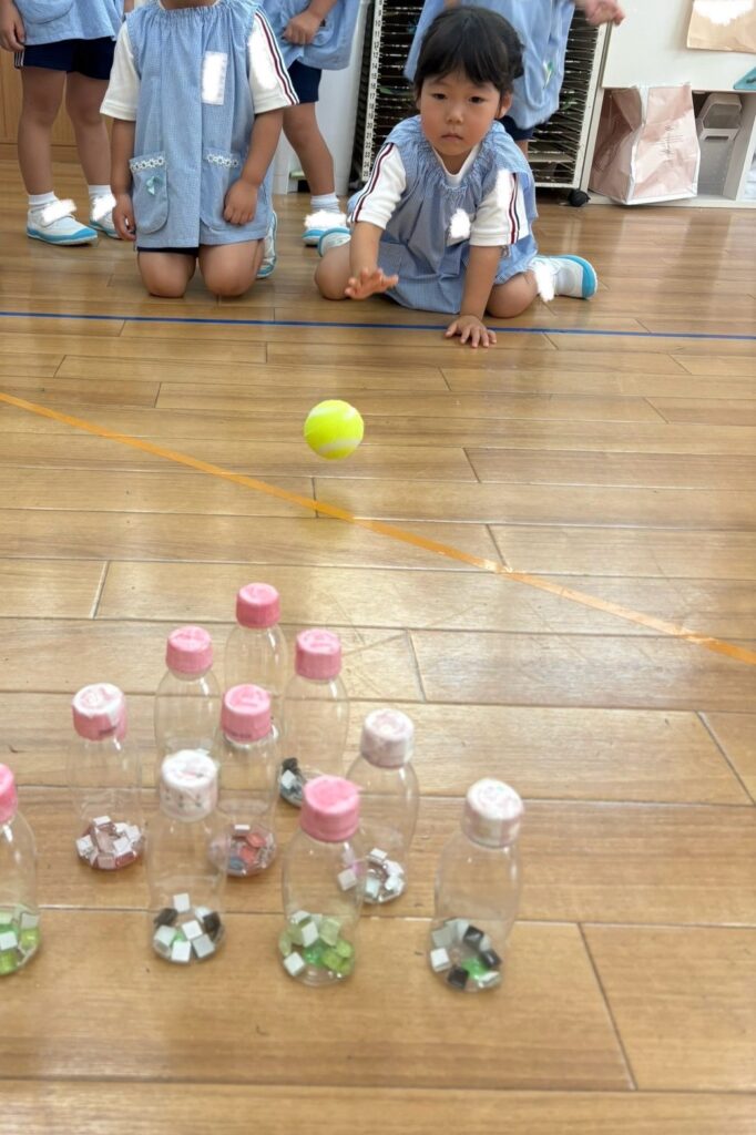 「もっと速く投げよう!」「真ん中から転がしてみよう」と意気込むお友達!
