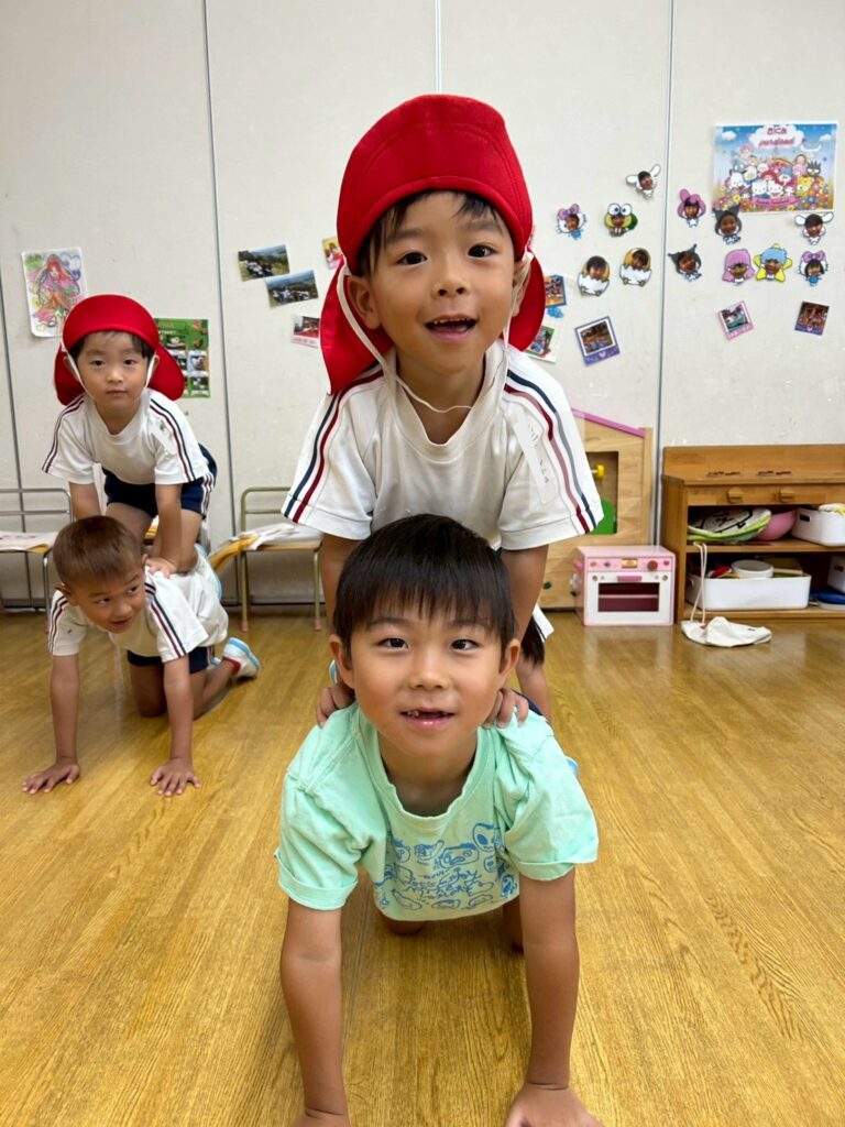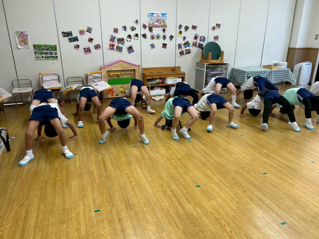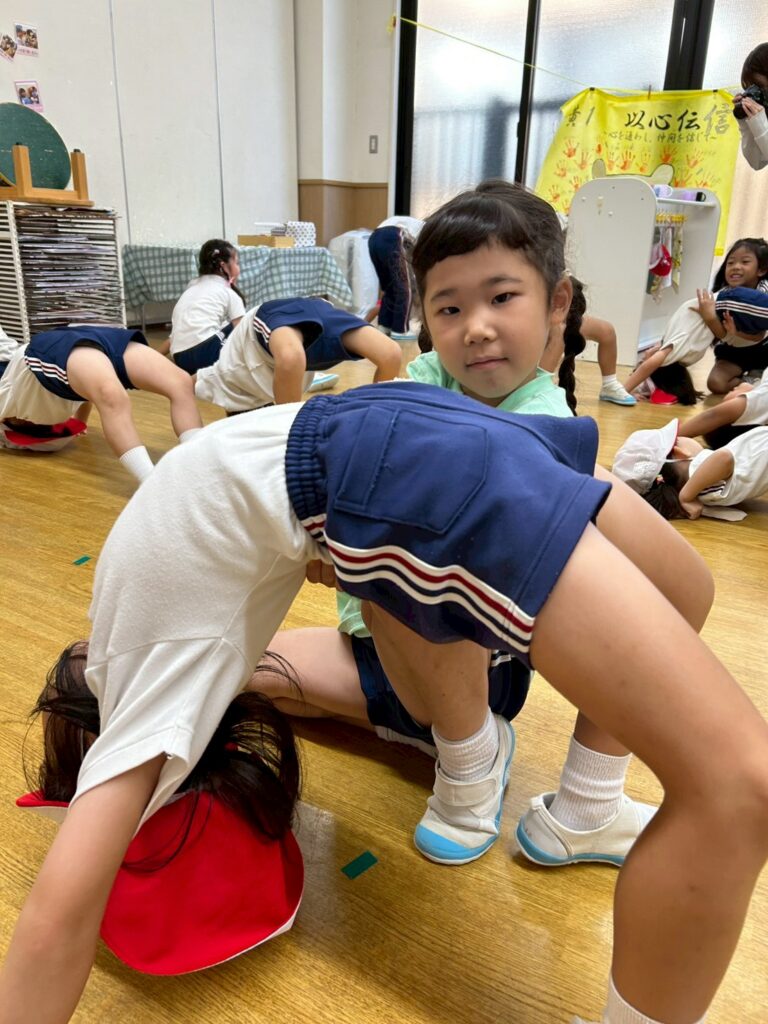 組体操では、「すべり台、片手バランス、ブリッジ」に挑戦!