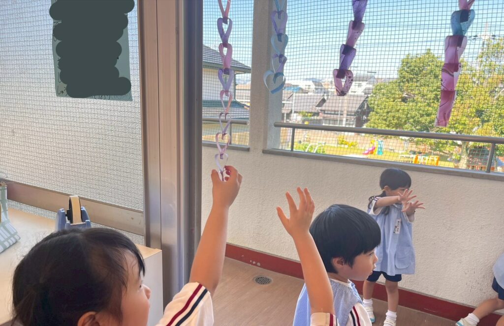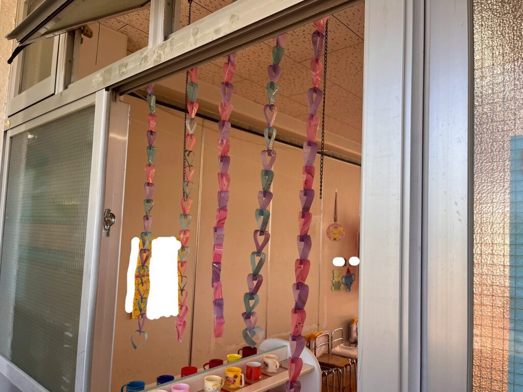 桜1組の扉に透明折り紙で作ったハートのカーテンを付けてみました🎶