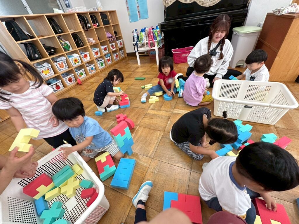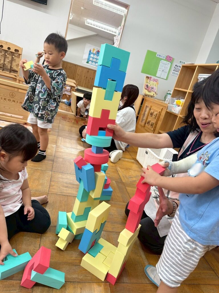 先生とお友達と一緒にブロックを高く積み上げます!